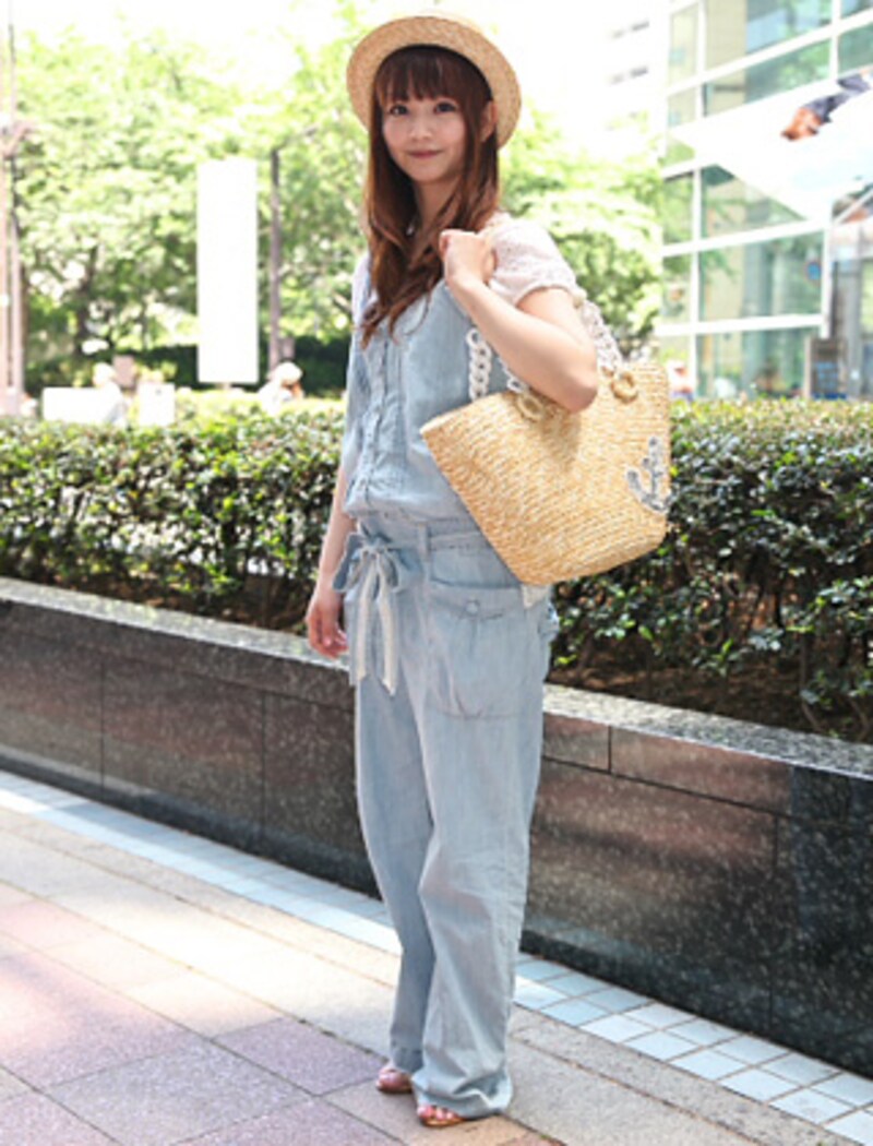 | オールインワンはスナイデルのもの。白トップスを合わせて、清潔感のあるスイートを演出。かごバッグはシップスで購入したラメ入り。(読者モデル 亀山美香子さん) この夏のヒットアイテムのひとつは、オールインワン。サロペットやロンパースタイプなど、デニム地のコンビネゾンも、たくさん登場しています。ショート丈、カプリ丈、フルレングスと丈もさまざま。1枚着るだけで旬スタイルに仕上がるアイテムですが、白インナーをコーデした爽やかな着こなしが目につきました。 オールインワン支持者はおしゃれ上級生が多いからでしょうか?カンカン帽や中折れ帽、ストロー素材の帽子をプラスして、より個性を際立たせている人が目立ちました。帽子に合わせてバッグもストロー素材を合わせて。 でも、バッグのデザインの選択は人それぞれ。スパンコールの錨の飾りがついたかごバッグで可愛らしさを演出したり、クラッチバッグで大人めなインパクトをつけたり、ちょっとした小物使いの選び方で、自分らしさを演出していました。
