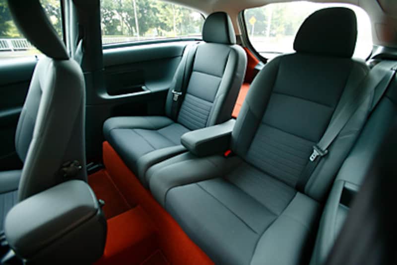 | リアは余裕を持った2シーター。センターのアームレストもインテリアに「軽み」を添える。オフブラックのインテリアとレッドカーペットのコントラストも美しい。 |