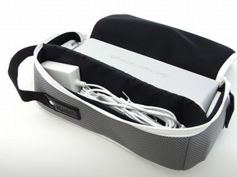 Mac用の「ScanSnap」の発売に合わせて開発されたものらしく、白を基調にしたコンパクトなキャリングケースですが、この中に「S300」と付属品全て(ACアダプター、電源ケーブル、USBケーブル、USB電源ケーブル)が収納出来ます。前面は圧縮ウレタンリコットを使っていて柔らかく、側面は樹脂の芯材を挟んだダブルラッセルメッシュでiPod nanoやTouchが入るポケットも付いています。