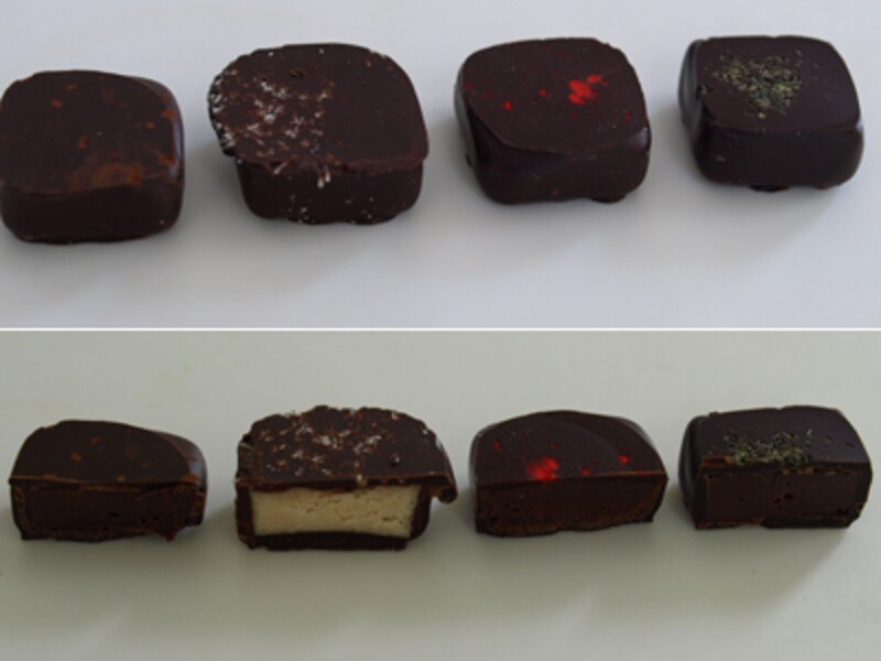 ケソパルメサノ(パルメザンチーズ):塩味のついた生クリームをパルメザンチーズに練りこみ、ダークチョコレートでコーティング。