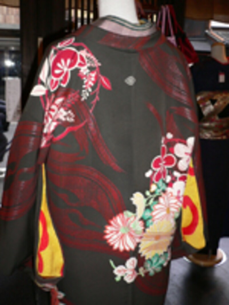 | 「今でこそ黒紋付の羽織を着る機会なんて殆どないと思いますが、昔はちょっとした御挨拶の時に、小紋の上から略礼装の意味合いを込めて黒紋付の羽織で出かけたりしたそうです」。袖口からチラリと見える長羽織の裏地がとってもお洒落!こうした裏地やちょっとした仕草で垣間見える部分にこだわるのも、着物の楽しさです。 |