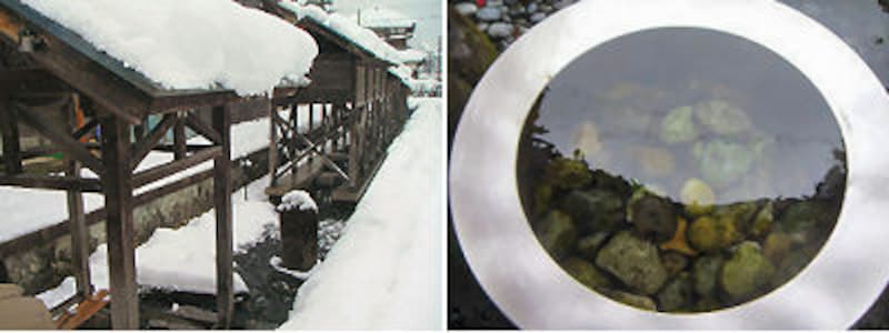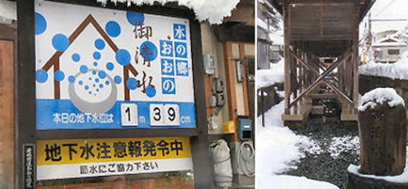 ![]() 屋根のある湧き水どころ「御清水(おしょうず)」。(=左) 透明感あふれる湧き水。年間を通してだいたい同じ温度なのだとか。(=右) |