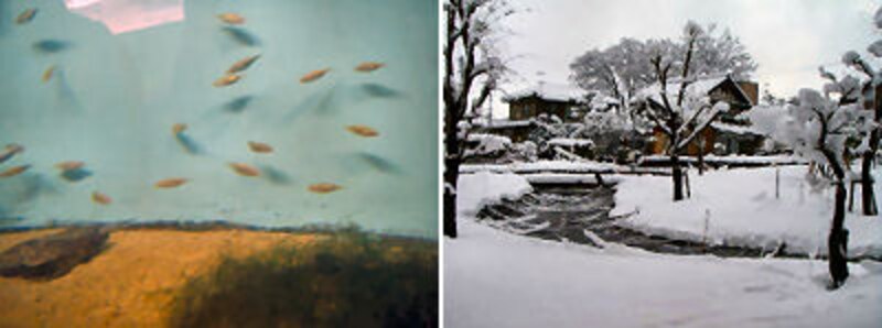 ![]() きれいな水でないと生息できない淡水魚「イトヨ」(=左) 「イトヨの里」の庭。最近あまり見たことのない雪景色だ。(=右) |