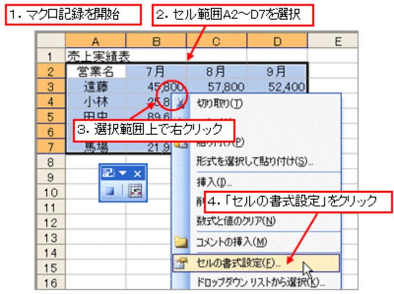 マクロ記録を開始したら、セル範囲A2~D7を選択して、選択範囲上で右クリックし、表示されたショートカットメニューから「セルの書式設定」をクリックします。