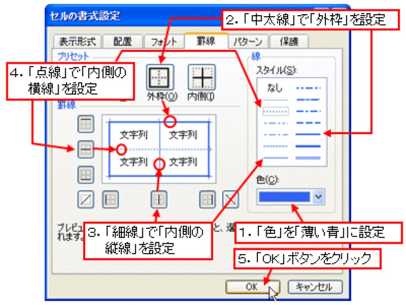 表示された「セルの書式設定」ダイアログボックスで「罫線」タブをクリックし、下図のように罫線を設定して「OK」ボタンをクリックします。