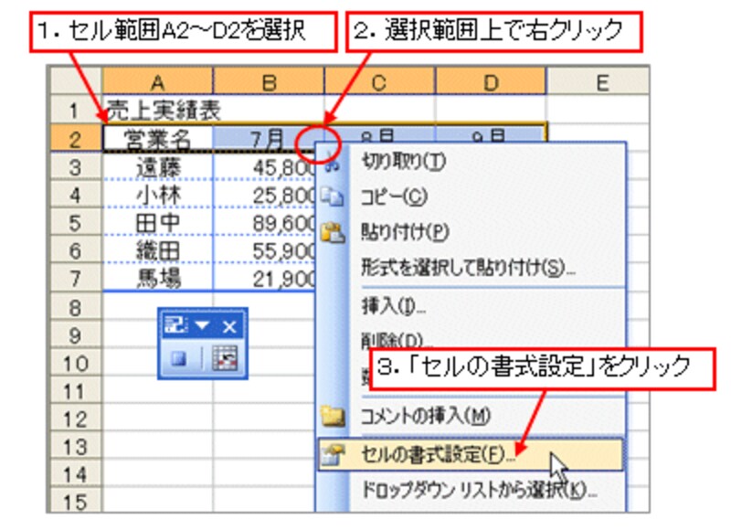 続いて、セル範囲A2~D2を選択して、選択範囲上で右クリックし、表示されたショートカットメニューから「セルの書式設定」をクリックします。