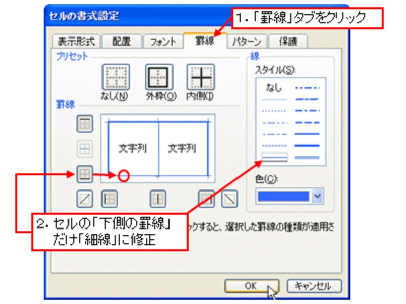 表示された「セルの書式設定」ダイアログボックスで「罫線」タブをクリックし、セルの「下側の罫線」だけ「細線」に修正します。