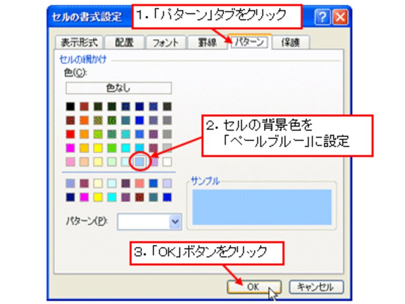 最後に、「パターン」タブをクリックして、下図のようにセルの背景色を設定して「OK」ボタンをクリックします。