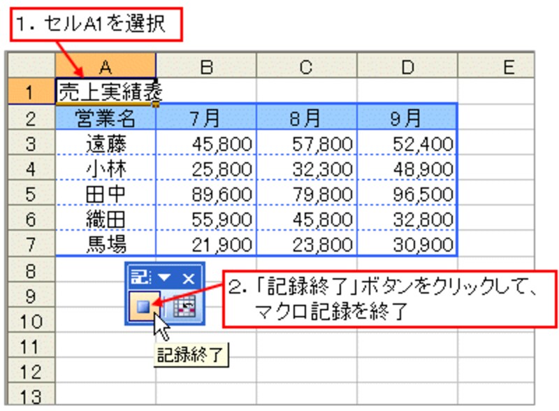 最後に、セルA1を選択して、マクロ記録を終了します。
