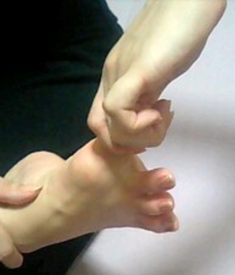 足の指を1本ずつ引っ張ります。次に1本ずつ回します。