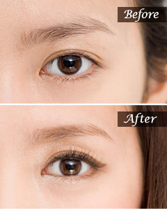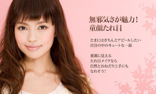 童顔風のタレ目を作るには、ブラウンのアイラインがマスト。ブラックだとキツい印象になるので、やわらかい色味を使い、あどけなさを残しましょう。黒目がちな瞳を演出するために、黒目を大きく見せるコンタクトを使うのもオススメです。顔の輪郭は丸く、頬はぷっくり仕上げると、童顔アイがさらに引き立ちますよ。