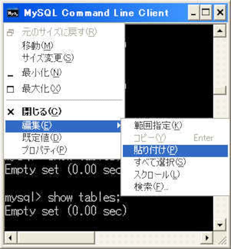 上のSQL文をコピーし、MySQL Command Line Clientのメニューの編集の貼り付けを