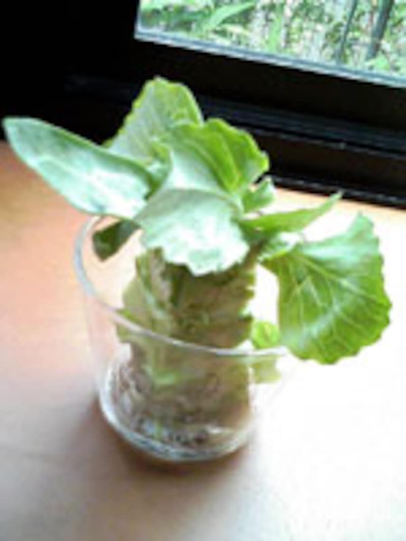 早速、キャベツの芯の部分を1/4ほどに切って、プリン容器に入れ、栽培開始♪小ネギや三つ葉くらいなら、よく栽培してみますが、キャベツはお初です。芯は葉の根元部分をちょっぴり残し、水は芯が腐りにくいよう容器の下約1cmの深さまでにして、キッチンの窓際へ置いてあげました。