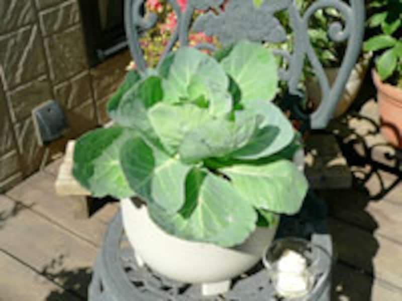 でもキャベツって暑さは苦手なんですね。真夏などに日向に置くとグッタリします。朝日が少し当たって半日陰になるスポットに置きました。それでも弱り気味のキャベツに、今度は虫がたくさんついたりしました。虫嫌いなガイドですが、割り箸片手に虫退治。無農薬で育てようと、ここはひとふん張りがんばりました。