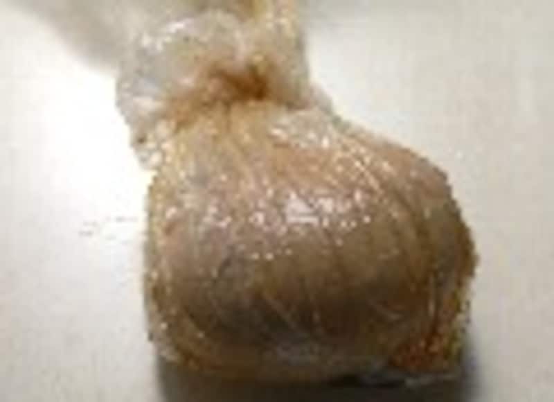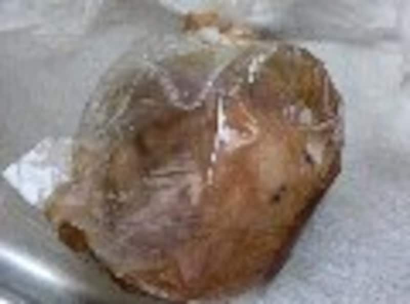 生姜の皮少々、胡椒少々を入れて軽くもんで、空気を追い出して口を硬く結ぶ。ご飯が保温してある