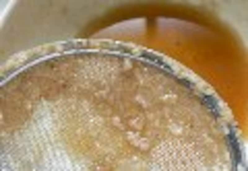 4.網杓子で氷と脂をすくい取って捨てる。卵の煮汁を加え、電子レンジにかけて、