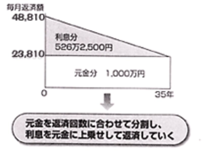 「元利均等返済」とは、毎月の返済額が決まっている返済方式のことを言います。最もポピュラーな返済方法で、ほとんどのローンで採用されています。特徴は、毎月の返済金額が一定になっているのでわかりやすく、将来の資金計画が立てやすいところです。また、毎月の返済額が抑えられるため、借り易い(返済しやすい)という特徴もあります。元金分を等分して毎月返済する「元金均等返済」