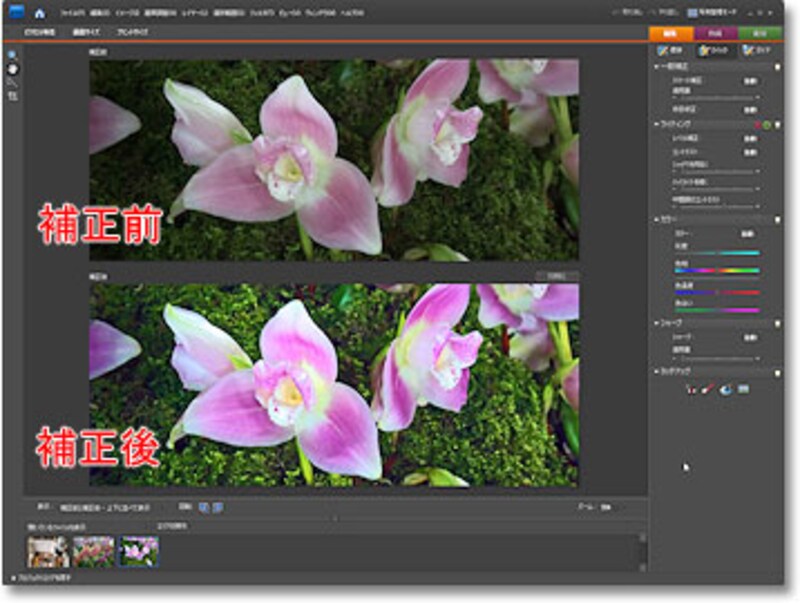 | 写真の高度な補正も、1画面だけでできる「クイック補正」画面。 |