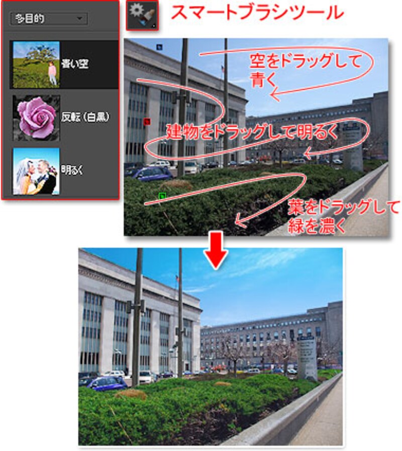 | 写真を部分的にドラッグして、それぞれの箇所の明るさや色を調整できる「スマートブラシツール」 |