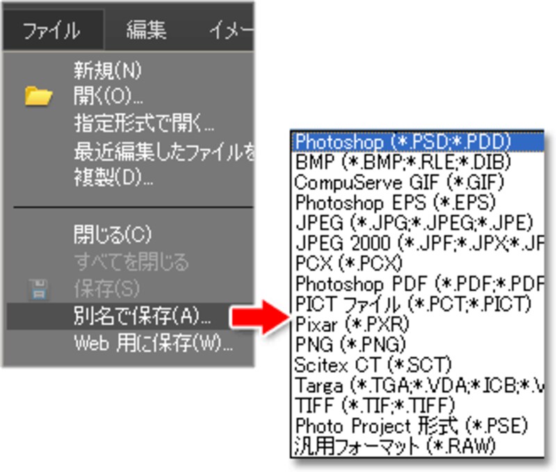| Photoshop Elementsでは、「保存」や「別名で保存」を選ぶと、さまざまな形式を選んで保存ができます。何を選んでいいのか迷ってしまったら、とりあえず「.PSD」で保存します。 |