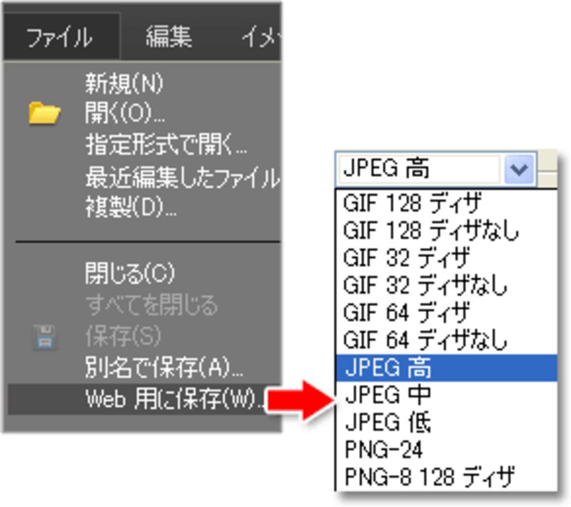 | 「Web用に保存」を選ぶと、JPEG、GIF、PNG形式に絞って、最適な状態で保存ができます。 |