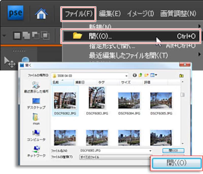 | ここではPhotoshop Elementsの「ファイル」メニュー→「開く」を選んでいます。 |