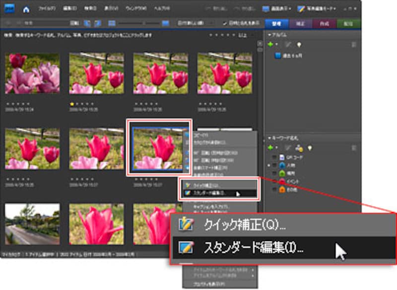 | ここではPhotoshop Elementsの画像整理モードで写真を選び、右クリックして「スタンダード編集」を選択しています。 |