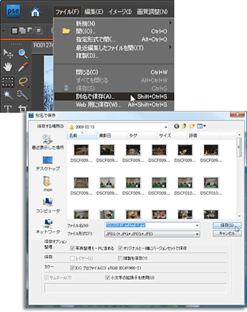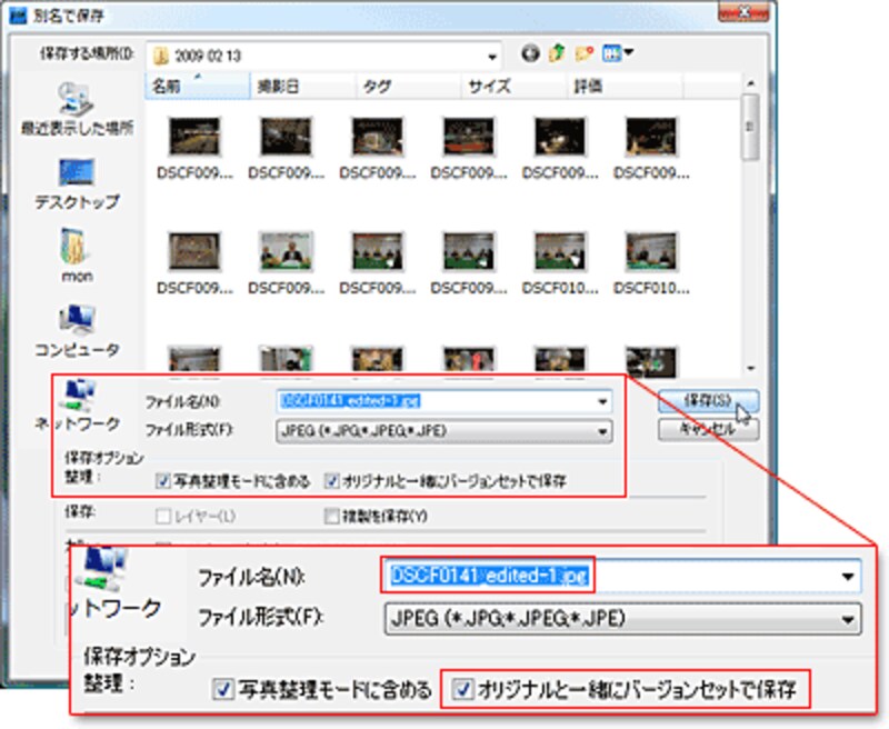 保存のダイアログボックスでは、保存する場所と、ファイル名を入力します。画像ソフトによっては、「バージョンセットで保存」というオプションがあります。これは、元の画像から派生した新たなバージョンの画像として、自動的にファイル名が付けられて保存できるので、有効にしておくといいでしょう。