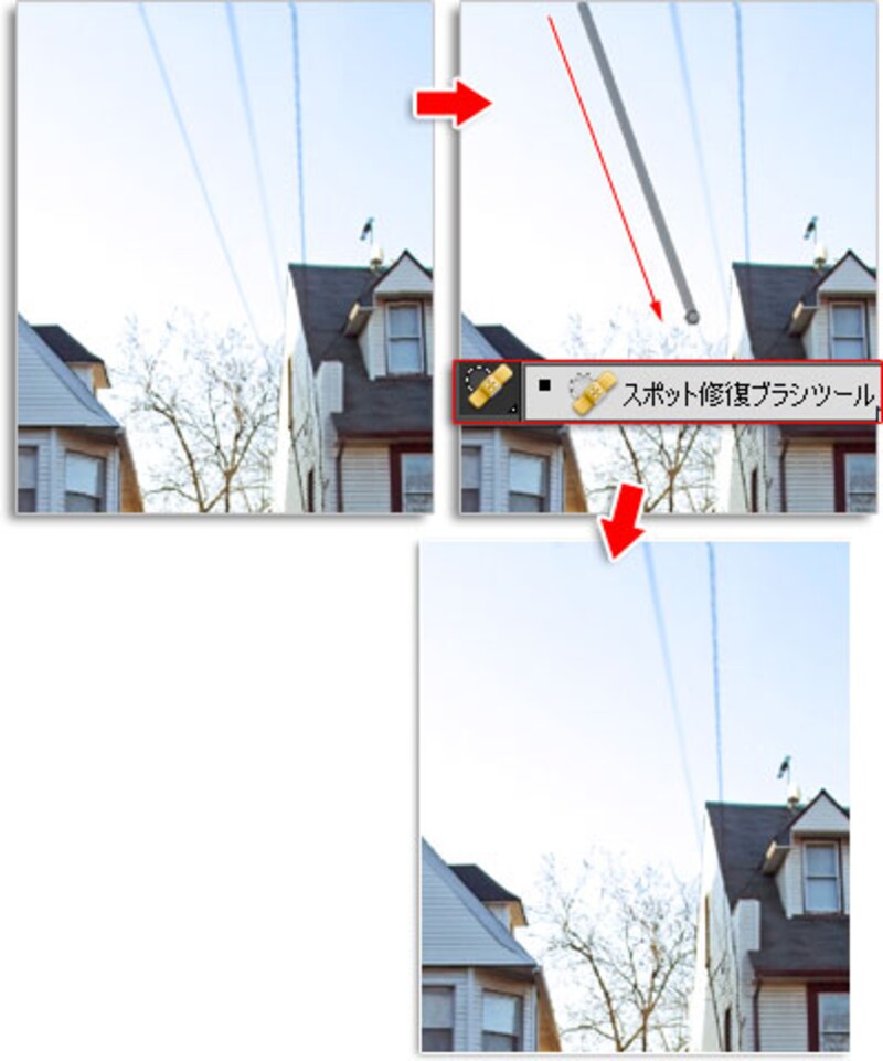 修復ブラシツールでは、電線をドラッグするだけで違和感なく消すことができます。顔の気になる部分の補正にもこのツールを使います。