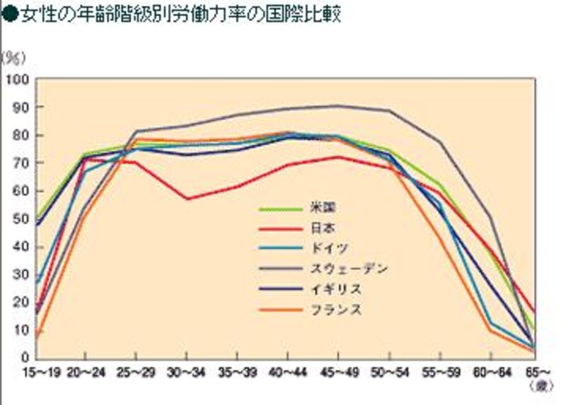 このグラフは、女性の労働力人口(15歳以上の働くことのできる人=就業者+失業者)なのですが、グラフの形がMのように30代前後で谷になっているのは、この時期に出産・育児で働くことができない人が増えるためです。年々、この谷は浅くはなっていますが、実はこのようなM字型現象は、先進国には見られない現象なのです。