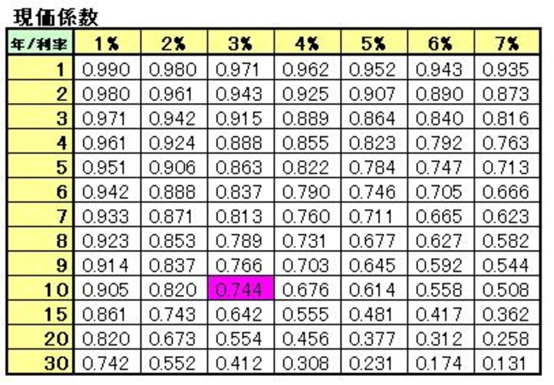 年3%の利回りで運用して10年後に1000万円にするには、現在 (1000万円×0.744=)744万円あればよいと表から分かります。