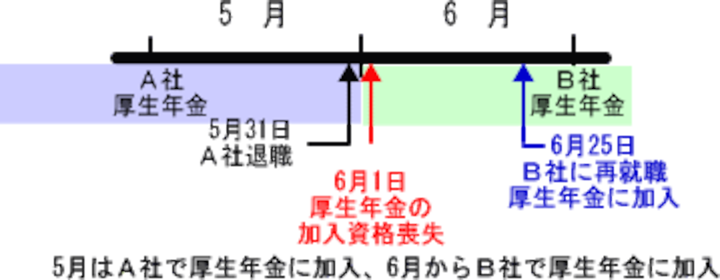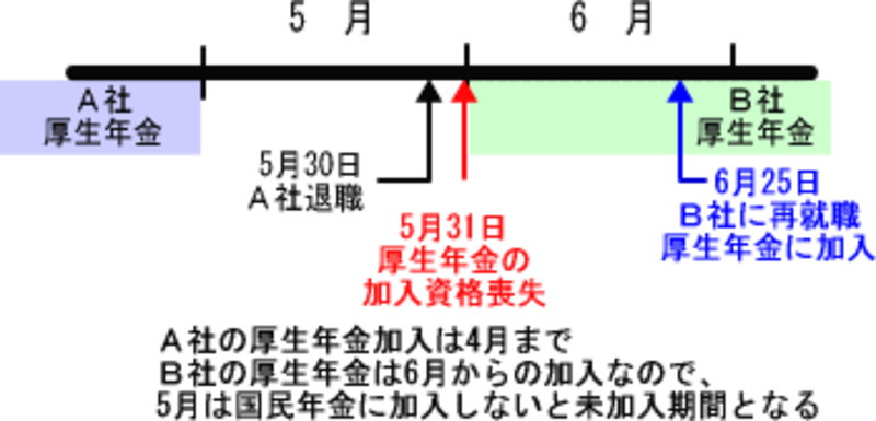 ただし、5月30日に退職して6月になってから再就職すると、5月は厚生年金に未加入なので1ヵ月でも国民年金に加入して保険料を納めなければなりませんので注意が必要です(例3、例4参照)。