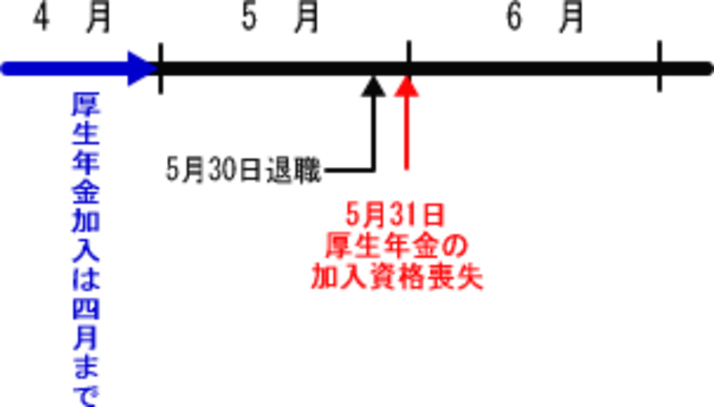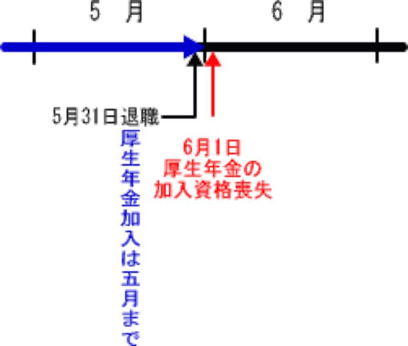 ところが、5月31日に退職すれば加入資格を失うのは翌日の6月1日になので、加入期間は5月までとなります(例2)。