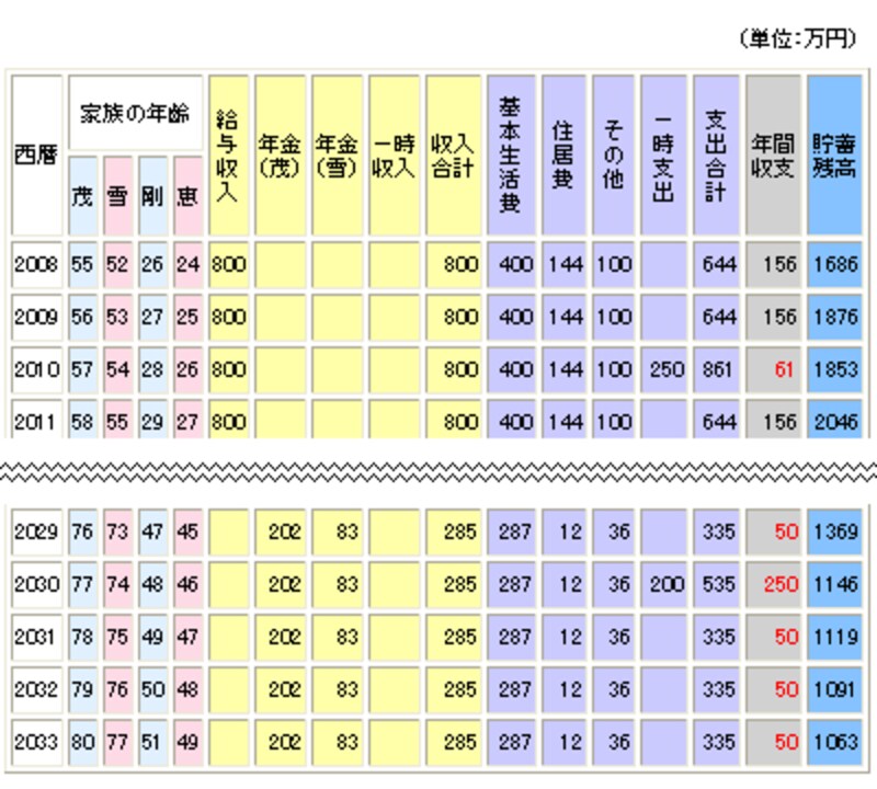 先ほどの斎藤さんが保有する資産(貯蓄残高)を仮に2%の平均利回りで運用を続けることができるとすると、80歳までのキャッシュフロー表は以下のように変わります。