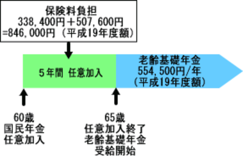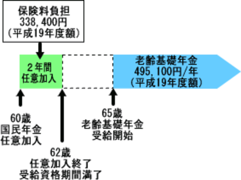 B輔さんが2年間で負担する保険料(平成19年度額で試算します)は、14,100円×12ヵ月×2年間=338,400円 になります。受給資格期間を満たして受け取ることができる老齢基礎年金(平成19年度額とします)は です。B輔さんは65歳から晴れて老齢基礎年金を受け取ることができます。792,100円× 300月(25年×12ヵ月)