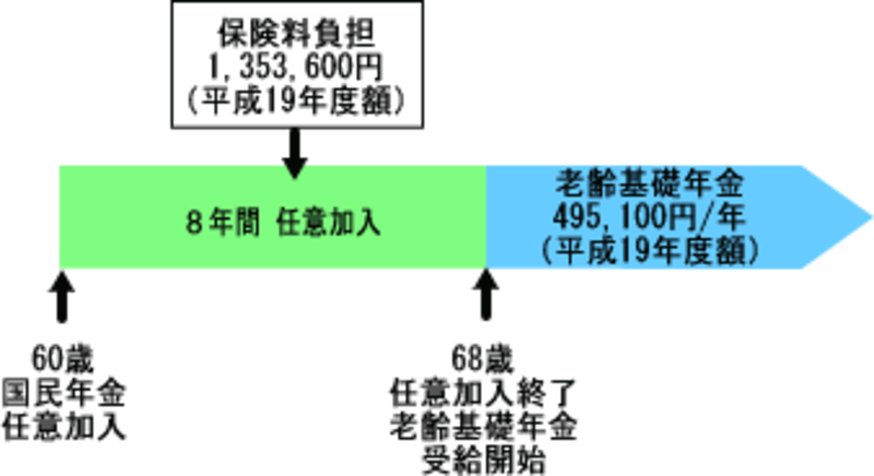 C美さん(女性)は現在60歳ですが、受給資格期間を満たすことができません。68歳まで任意加入すれば、加入期間がちょうど25年となり、受給資格期間を満たすことができるので、任意加入を申し出することにしました。C美さんが受給資格期間を満たすまで負担する保険料は、14,100円×12ヵ月×8年間=1,353,600円 になります。受給資格期間を満たして受け取ることができる老齢基礎年金は です。792,100円× 300月(25年×12ヵ月)