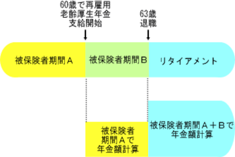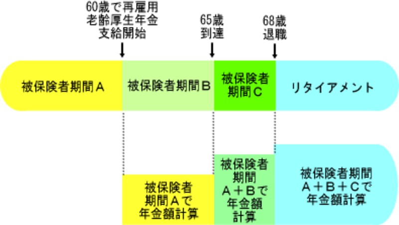 この場合、上図のように退職時の63歳で60歳以降の加入期間を加算して年金額が再計算されます。 - 60歳で再雇用、68歳で退職した場合