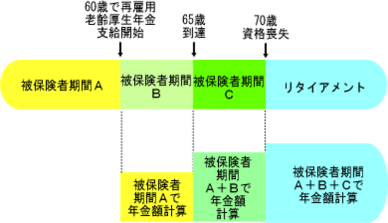 この場合は、上図のように65歳到達時と68歳の退職時の2回、年金額の再計算が行われます。 - 60歳で再雇用、70歳で退職した場合