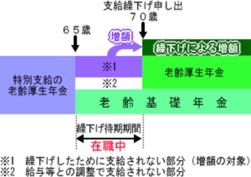 繰下げで増額されるのは65歳から受け取る老齢厚生年金です。60歳~65歳でもらうことができる特別支給の老齢厚生年金(定額部分と報酬比例部分)は、繰下げ制度の対象にはなりません。なお、特別支給の老齢厚生年金を60歳からもらっていたとしても、65歳からの老齢厚生年金の繰下げ制度を利用することはできます(下図参照)。