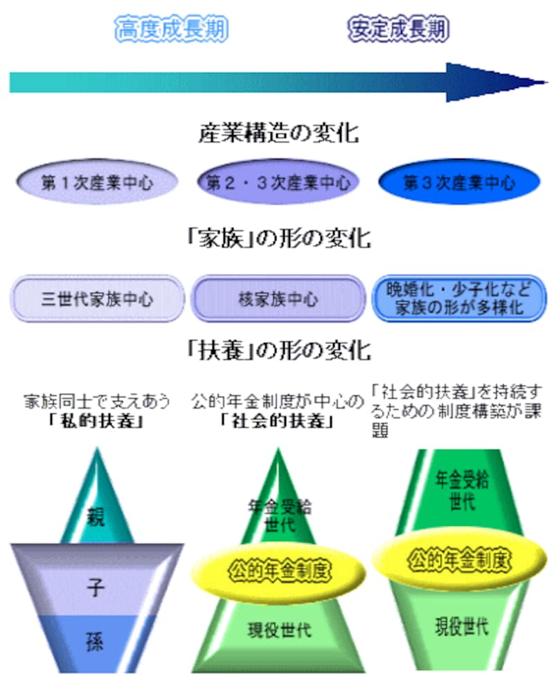 日本が高度成長期を迎える前までは、三世代家族が中心で、家族内の私的扶養が中心となっていました。しかし、核家族化が進むと、それまでのような家族内の私的扶養で親の生活を支えることは困難になり、社会全体で現役世代が高齢者世代を支えるという世代間扶養へと移ってきたのです。