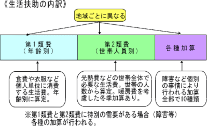 保護費全ての基準になるのは、住んでいる市(区)町村です。全国の市(区)町村を6つのグループに分類し、物価差などを反映して、それぞれの基準額を設定しています。生活扶助基準は、衣食などの日常生活に必要な基本的な最低生活費を表しますが、以下のような構成となっており、基本となる基準額に特別の需要のある人の場合には、さらに各種の加算が合算されるしくみとなっています。