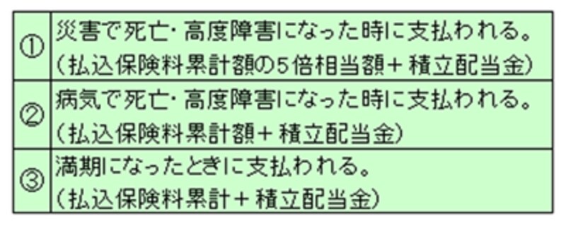 財形貯蓄「保険型」は保険ですから保障が付いており、生・損保共に災害死亡・高度障害の場合、年金の支払開始前であれば、払い込み保険料累計額の5倍相当額が積立配当金と共に支払われます。
