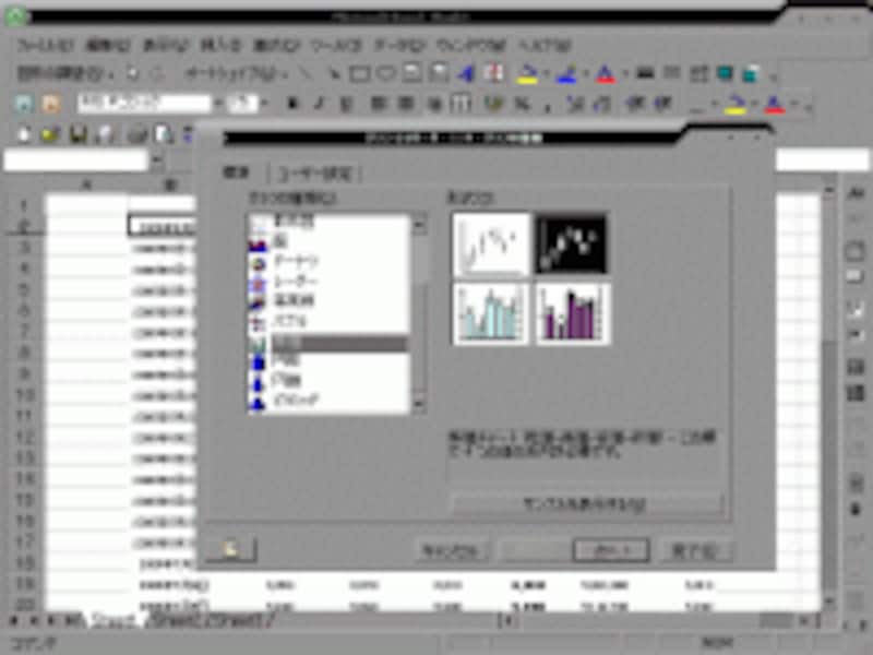 そしてグラフ作成画面が出ますので、グラフは図2のように株価を選び右上のローソク足を選択します。そのまま作成を続けて、設定を多少変更していくと図3のようなチャートグラフが作成出来ます。