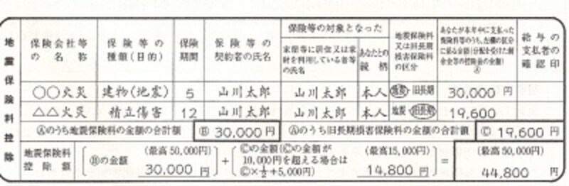 この記載例のポイントは保険会社等の名称と保険等の種類(目的)が相違していることです。つまり、山川太郎さんは地震保険料控除に該当する保険と旧長期損害保険契約に該当する保険と別個に契約していることになります。