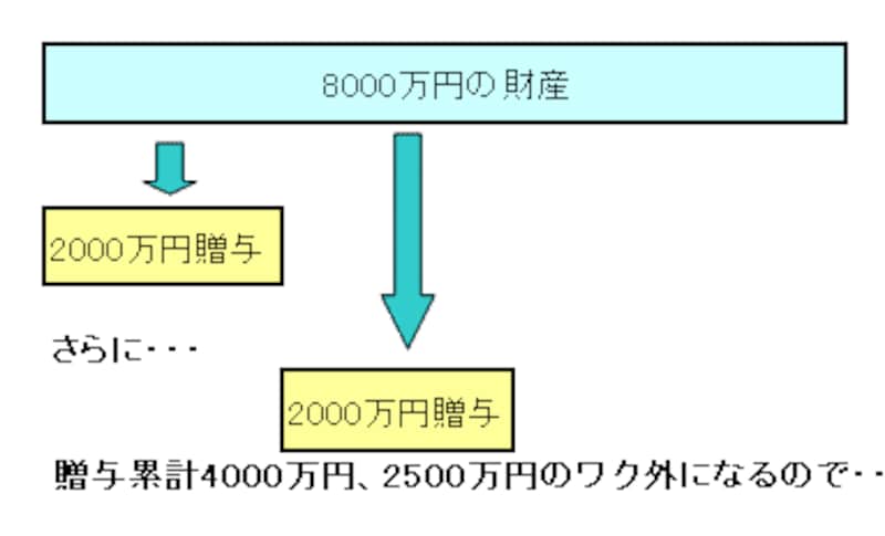 しかし、同額2000万円の贈与が2回行なわれた場合にも、無税とできるのでしょうか。この場合は、累計すると贈与額が4000万円となり、2500万円のワクを1500万円飛び出ていることになります。