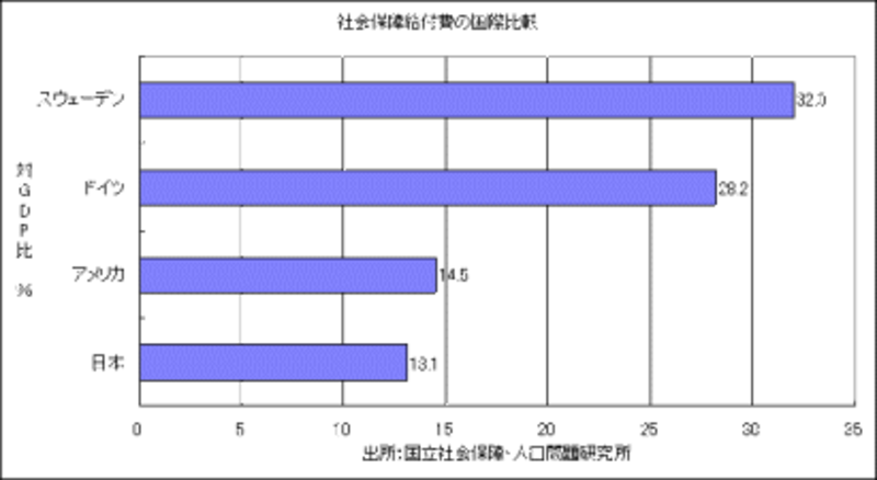 下記、国立社会保障・人口問題研究所のデータによるとGDP(国民総生産)に対する社会保障費はスウェーデンが32%と非常に高く,ドイツ28.2%,イギリス27.2%,アメリカ14.5%と続き,日本はわずか13.1%にすぎません。
