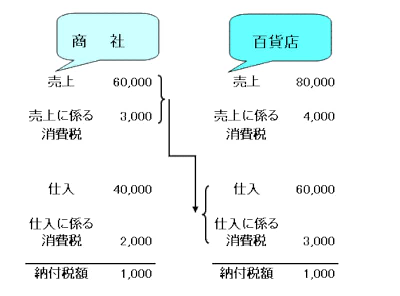 この際の商社はメーカーに支払った消費税2000円と百貨店から預かっている消費税3000円の消費税の差し引き1000円の納税義務が生じます。