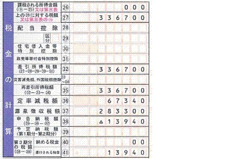 税金の計算は給与所得に対応する金額266700円と株の儲けに対する税金70000円の合計の336700円となりますが、定率減税20%を差し引くことができます。