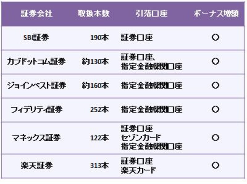ここでは、国内株式、外国株式(先進国)、外国債券(先進国)、外国株式(新興国)の4資産を対象にしましたが、中でもフェデリティ証券の充実度が光ります。大差はありませんが、ジョインベスト証券、SBI証券、楽天証券も多いようです。