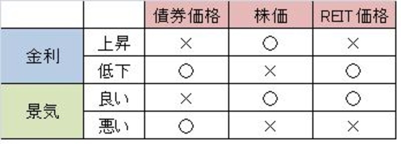 下の表は、景気と金利が、債券・株・REITのそれぞれの価格にどう影響を及ぼすかを示したもの。